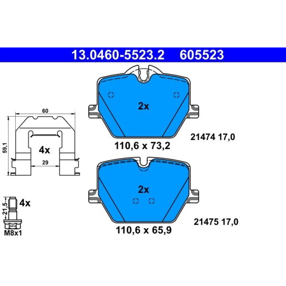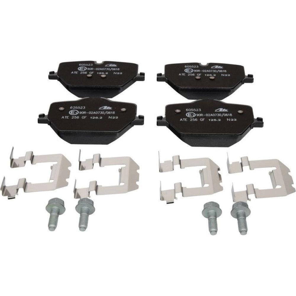 ATE 13.0460-5523.2 Bremsbeläge für Verschleißwarnanzeiger vorbereitet, exkl. Verschleißwarnkontakt, mit Bremssattelschrauben, mit Zubehör