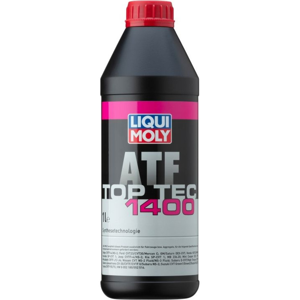 Hochleistungs-Automatikgetriebeöl der neuen Generation auf Basis von Synthesetechnologie. Es wurde speziell für den Einsatz in CVT-Getrieben mit Schubgliederband oder Traktionskette aus Stahl entwickelt. Die Basis moderner Grundöle und ausgewählter Additive bieten den bestmöglichen Schutz gegen Verschäumen, was bei CVT-Getrieben notwendig ist. Ebenso weist es eine sehr gute Alterungs- und Oxidationsstabilität auf. Top Tec ATF 1400 ist erprobt und bewährt, vor allem in den Autotronic-Getrieben der Mercedes-Benz A und B-Klasse als auch in stufenlosen Automatikgetrieben (Multitronic) in Audi-Fahrzeugen.