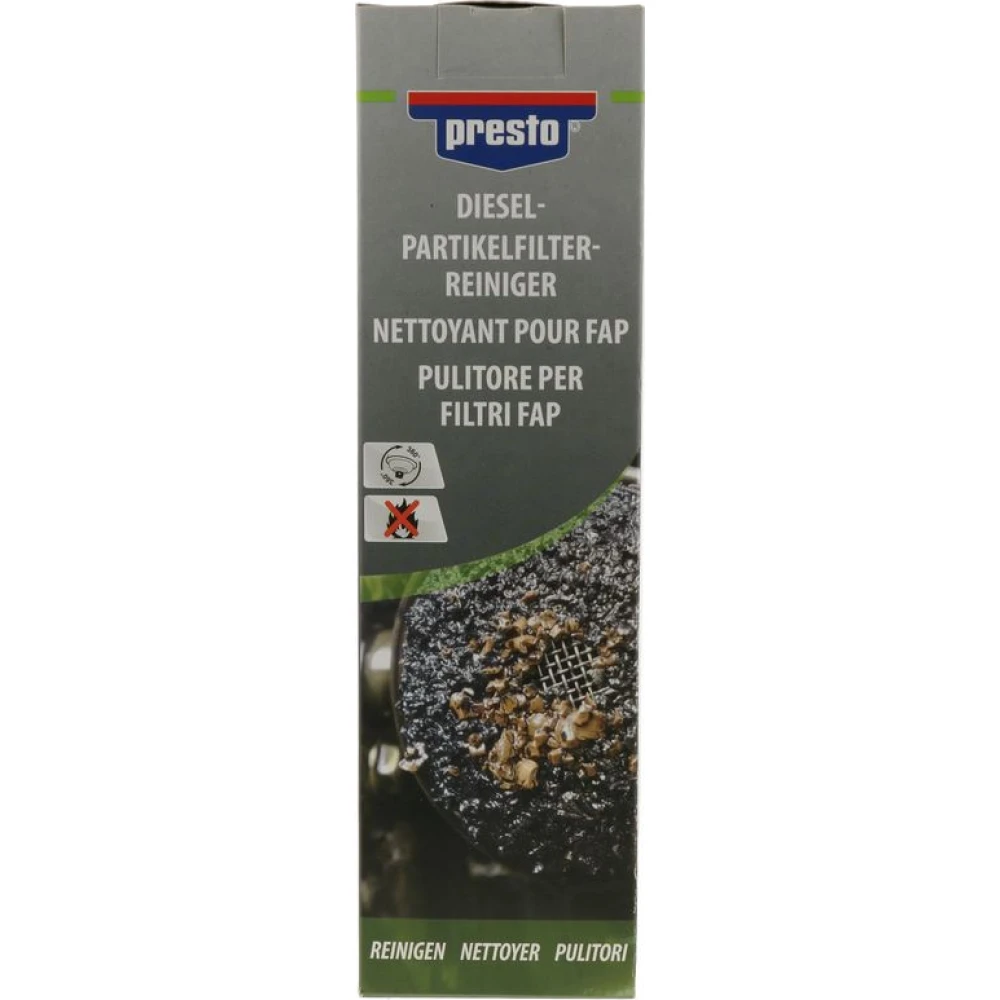 Effektiver Reiniger für Dieselrußpartikelfilter. Zum Lösen u nd Entfernen von Kohlenstoff- und Asche-Ablagerungen in Dies el-Partikelfiltern. Die Reinigung ist ohne Demontage des Filters möglich. Das Pr odukt hat eine schnelle Wirkung und ist nicht korrosiv. Der presto DPF-Reiniger ist zudem lösemittelfrei und unbrennbar.