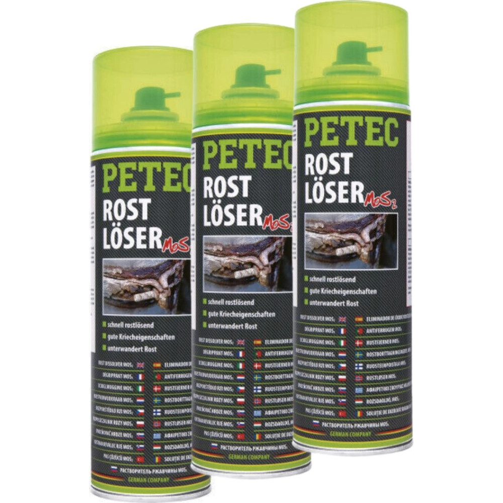 Zum schnellen Lösen von festsitzenden Verbindungen, wie z. B. Schrauben, Muttern und Bolzen. Rostlöser dringt durch eine hohe Kapillarwirkung und sehr gute Kriecheigenschaften auch in kleinste Zwischenräume. Durch den Einsatz von MoS2 kann PETEC Rostlöser auch bei extremen Temperaturen und Druckbelastungen eingesetzt werden. Rostlöser – für festgerostete Schraub- und Metallverbindungen Schmiermittel – für bewegliche Teile, beseitigt Quietschgeräusche Konservierungsmittel – entfernt Flugrost und konserviert langfristig Korrosionsschutz- & Pflegemittel – schützt nachhaltig vor Korrosion